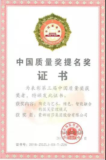 【點評】作為質量領域國家級的最高獎項,蒙娜麗莎集團繼獲得廣東省政府質量獎、佛山市政府質量獎之后,再次問鼎第三屆中國質量獎提名獎,充分體現了蒙娜麗莎集團先進的質量管理體系和質量水平。中國質量獎提名獎,不但是全行業唯一,而且是2018年度全佛山唯一,足見其含金量之高。蒙娜麗莎將依此為起點,從中國制造,走向中國“質”造和中國“智”造,繼續領跑行業高質量發展,為消費者提供更多質量過硬的產品和服務。