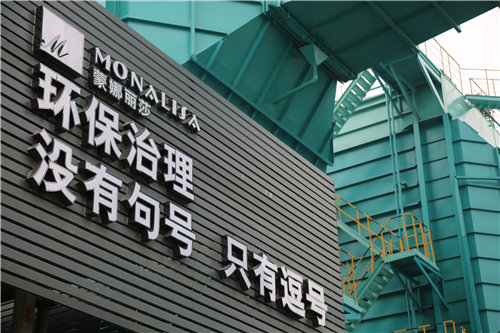 相對應的,在在蒙娜麗莎集團西樵生產基地的煙氣排放口設備上,一句醒目的標語:“環保治理,沒有句號,只有逗號”,正成為蒙娜麗莎的環保行動指南。