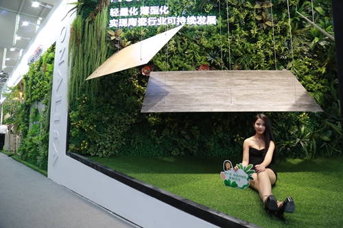 其中2400mm×1200mm超大規格陶瓷板以其超大規格、創意的設計、立體的觸感一度成為本次展會的熱點。在蒙娜麗莎綠色科技館上,2400mm×1200mm×5.5mm陶瓷板,僅用四根超細鋼絲吊起,讓參觀人員更加直觀感受到陶瓷板的“大、薄、輕、硬、韌”。與此同時,展位更通過不同的空間設計語言,展現陶瓷板從墻、地跨界到家居產品的的多種應用。