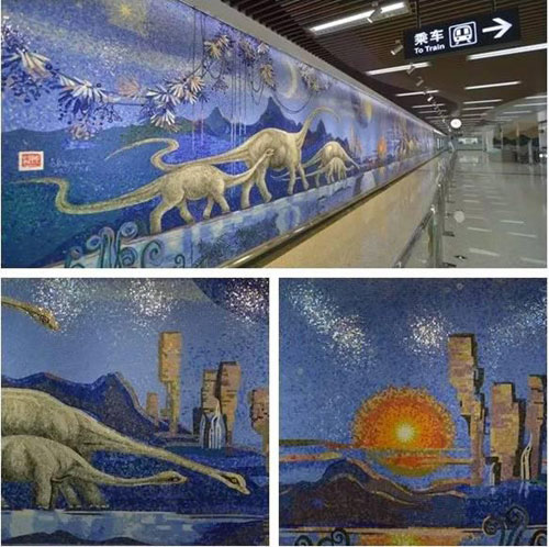 制作壁畫的過程中使用的材料,剛開始考慮用玻璃鋼制作成高浮雕效果,但壁畫安裝在公共空間,地鐵客流量大,其占據(jù)的空間過大,并且考慮到牢固度和安全性等問題,不便采用玻璃鋼材料。最終決定用馬賽克來制作馬門溪恐龍壁畫。