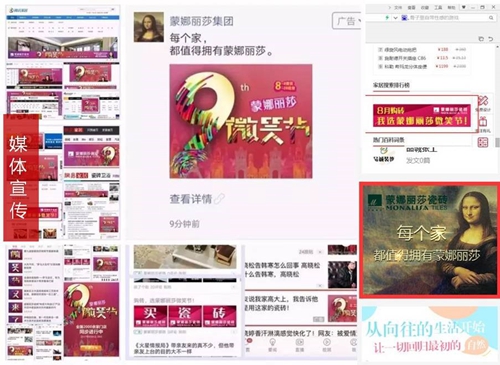 第九屆蒙娜麗莎微笑節通過大面積高強度全覆蓋的密集型媒體廣告投放,傳遞強大的品牌實力的同時,激發用戶對蒙娜麗莎瓷磚品牌的認知。